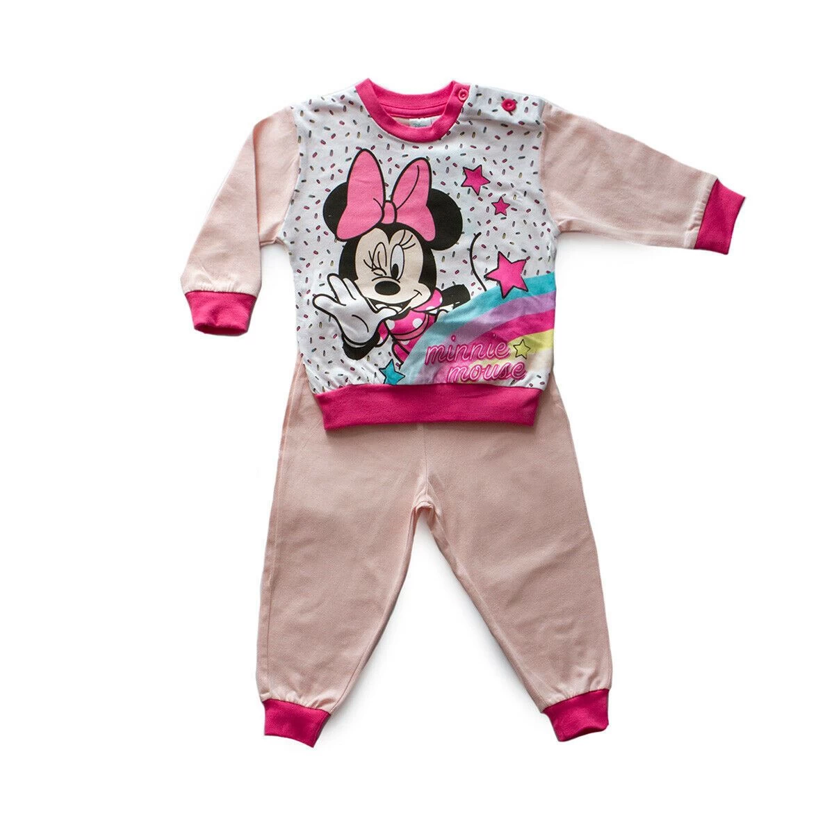 | Dettagli | La confezione contiene un pigiama per bambina in cotone composto da: Una maglia stampata manica lunga con bottoni sulla spalla e polsini elasticizzati Un pantalone tinta unita con elastico in vita e comodi polsini elasticizzati Polsini in contrasto di colore Stampa ispirata a Minnie Motivo maglietta con stelle colorate Prodotto dalla licenziataria ufficiale del brand |