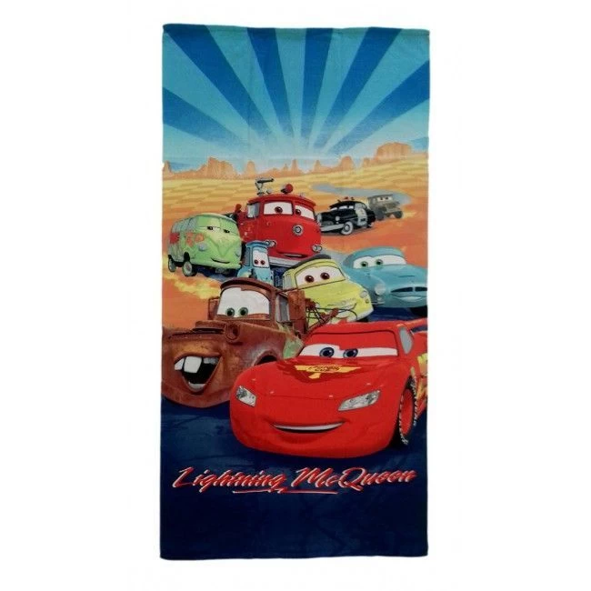 Telo da mare Modello: Telo da mare in spugna 100% polyestere con disegno e scritta Disney Cars su sfondo azzurro rifinita con bordo Art: T1727 Materiale: 100% polyestere Colore: azzurro/rosso Caratteristiche: misure 70×140 cm